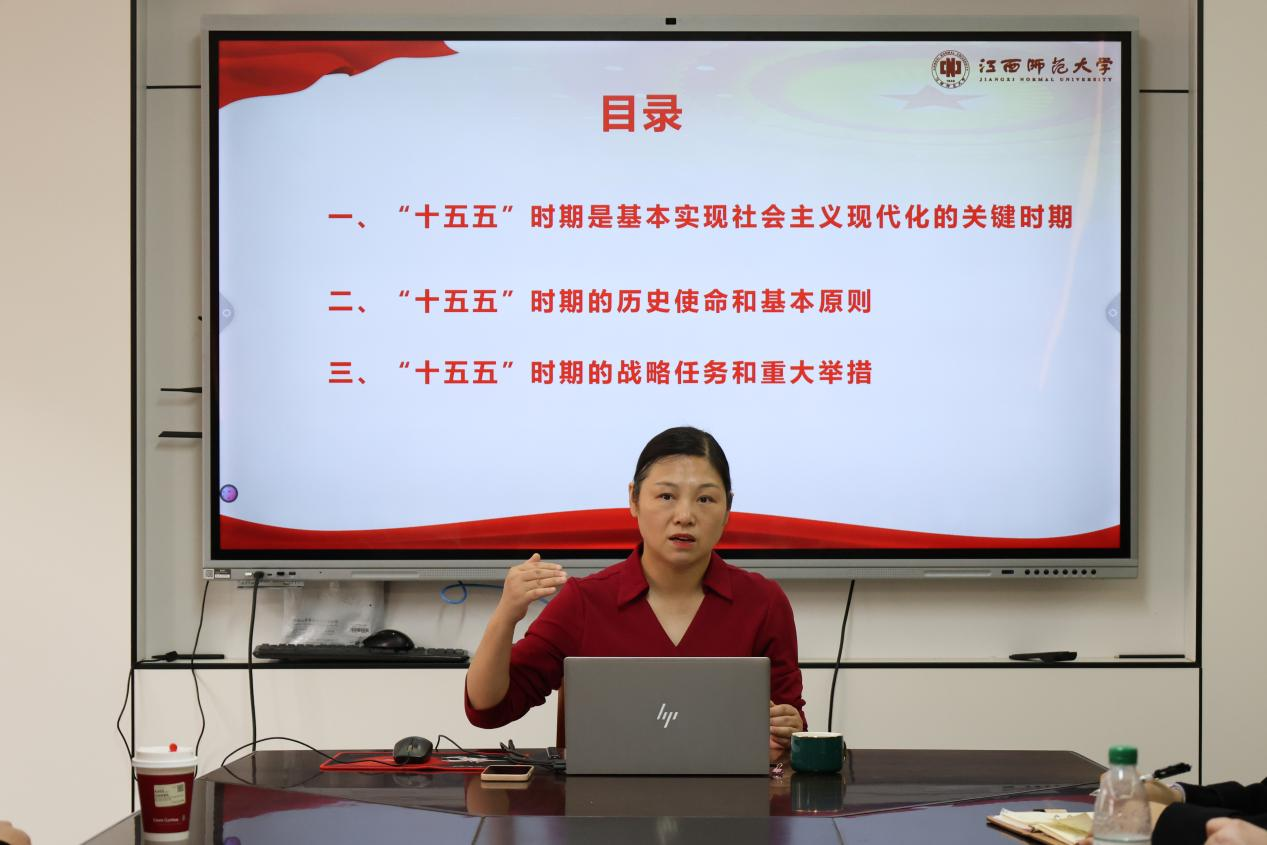 骆江玲从“十五五”时期的背景、历史使命,基本原则、战略任务,重大举措等维度,对全会精神进行了系统阐释和深入解读,她重点剖析了中国式现代化建设在“十五五”时期的核心部署和发展规划。她指出,党的二十届四中全会是在我国全面建设社会主义现代化国家新征程的关键时期召开的一次重要会议。全会审议通过的《中共中央关于制定国民经济和社会发展第十五个五年规划的建议》,为我国未来五年的发展指明了方向、提供了遵循。我们要紧密团结在以习近平同志为核心的党中央周围,坚定信心,奋勇前行,为基本实现社会主义现代化而努力奋斗,不断开创中国式现代化建设的新局面。