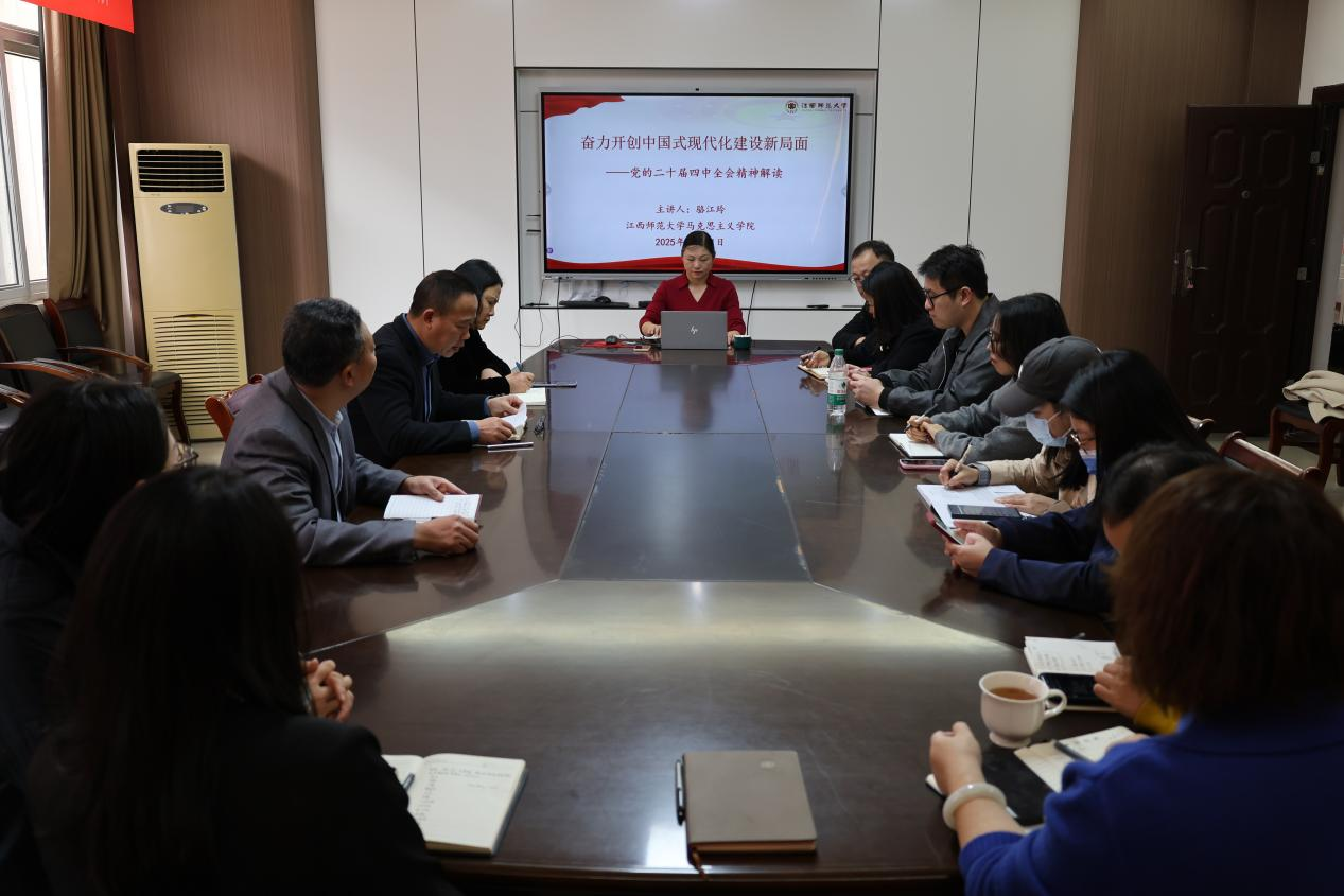 为深入学习贯彻党的二十届四中全会精神,11月11日,国际教育学院邀请学校宣讲团成员、马克思主义学院概论教研部副主任骆江玲到学院宣讲党的二十届四中全会精神,学院党委副书记、院长饶文华主持宣讲会,学院班子成员、全体教职工参会。