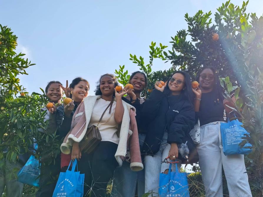 橘香满园,硕果压枝。同学们走进柑橘园化身“采摘客”,一边动手采柑橘,一边学习辨别果实成熟度的技巧。现场游客络绎不绝,大家手提满袋柑橘,笑容洋溢。在一片欢声笑语中,同学们切身感受到体悟“体验+销售”这一乡村经济新模式的活力。越南学生阮玲竖起大拇指:“特色农业与乡村旅游在这里完美融合,游客既能欣赏生态美景,又能享受采摘乐趣,乡村正凭自身资源优势走上高质量发展之路!”